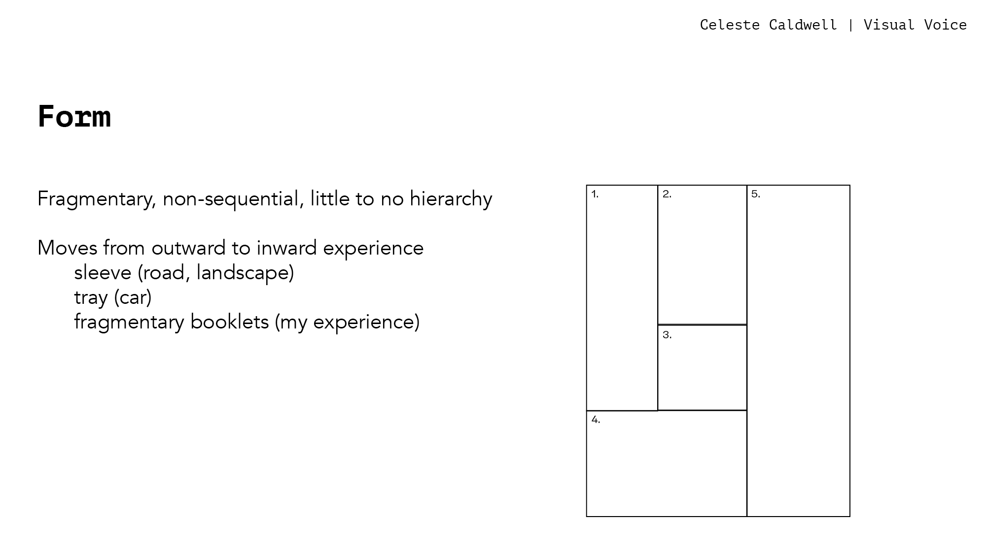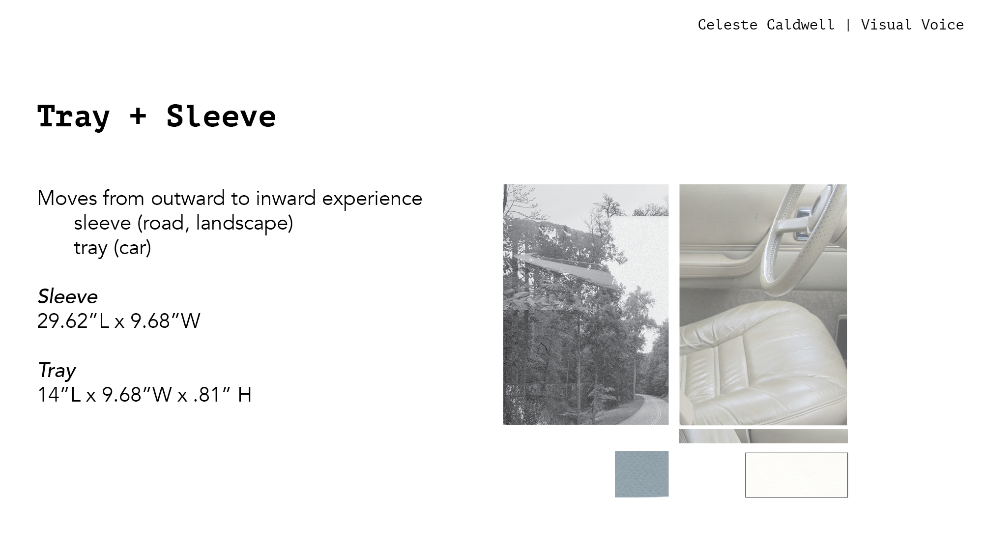 Driving the Parkway is an abstract analog experience that invites viewers to parse through my memories of driving down the Blue Ridge Parkway. The exterior vellum sleeve uses collaged archival images to represent the road and landscape, the tray itself acts as the car interior, and the artifacts within the tray each symbolize a sensory element of the remembered experience. The five sensory memories represented are: the breeze rushing through the windows, the way your body sways as your wrap around the curves of road, the fresh, earthy smell of dew, the swathes of blue and green as the mountains run into the earth, and the sound of crickets and cicadas.